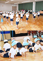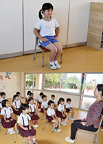 | 今日は年少 うさぎ組の 研究授業! 先生のまねっこで 体を柔らかくします 同時に集中力も養われます |