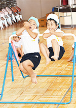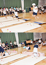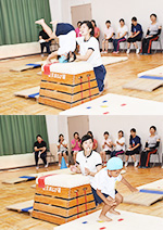 | 実際に台上前転に挑戦 真剣な眼差し |