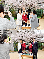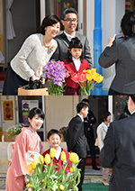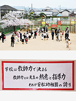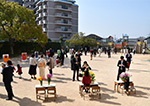 ドキドキの式も終わり 園庭でリラックス 向こうに 見える芝生運動場も あなた方を 待っていますよ |