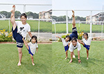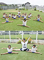 | 新体操 国体出場の先生の 真似をして 脚をビュンっと 高く上げます |