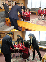 市長さんに花束と | 育友会バザーの 収益金の中から寄贈します そして市長さんより 感謝状を頂きました |
