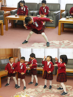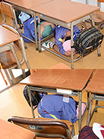 | 次は避難訓練です さっと机の下にもぐって 頭を守る |