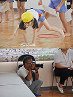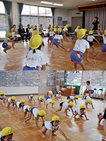 年長 桃組 開脚跳び前の準備運動です 身体を柔らかくします 記者も熱心に質問です |