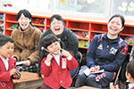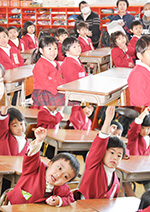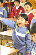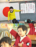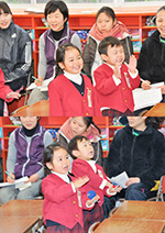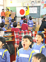 | 子どもも千代松泉佐野市長も思わず笑みが | 先生の君が代のお話に 心動かされた様子が 顔・動作に表れています |