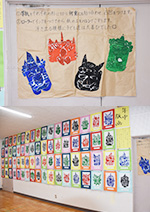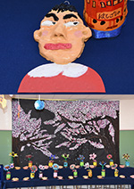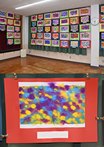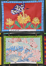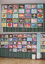 作品展 ホールでの掲示です 年長はちぎり絵 102人 102通りの花が咲きました |
