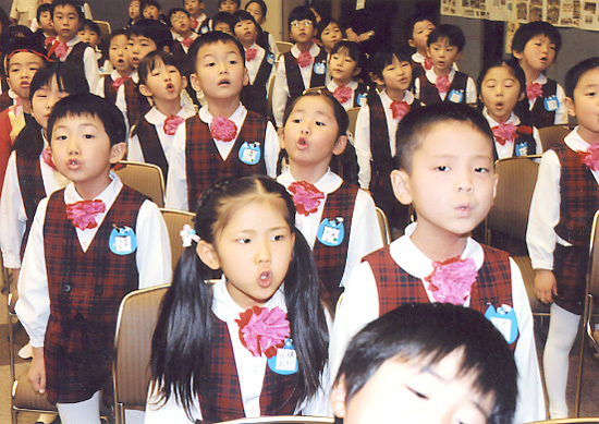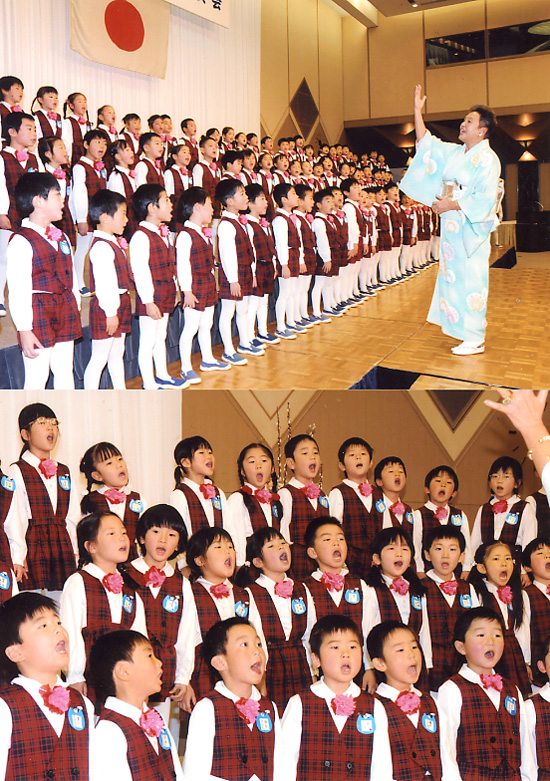 | 「いい顔・いい声・いい心」 子ども達の気持ちを込めた歌声に、指揮の先生も楽しそう。 |