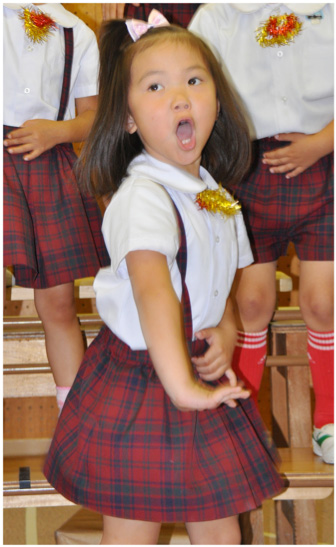 妹の雅が芽生え教室で園に行くと、毎回練習中の歌が聞こえてきて、それと一緒に音楽的に細かい部分まで指導をされている先生の声も聞こえてきました。なので本番がすごくすごく楽しみでした。5月、梅組で年長全員の歌“花”を練習中に、雅が教室に入れてもらった時、もうすでに歌声に迫力があったので、あと一ヵ月したら、どんなすごい事になるんだろうと思っていました。