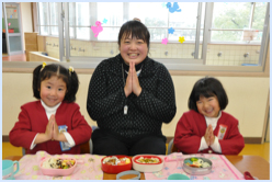 食事時の挨拶や食事をいただける幸せについては、年少はまず形から、年中・年長と進むにつれて、その意味を深めて説明していきます。