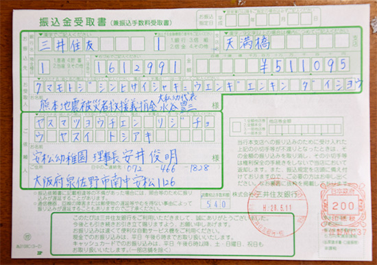4月末に、熊本地震の被災者の方に心ばかりの募金をお願いしたところ、多くの園児・保護者の方(260名)から、協力を頂きました。とても嬉しいです。感謝申し上げます。