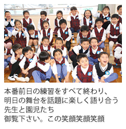 観客席から、割れるような拍手が長い間続きました。それは、園児たちのすばらしい演技に対する賞賛の拍手だけではなく、先生方のご指導をねぎらう拍手、いや、安松幼稚園の教育に対する信頼の拍手ではなかったでしょうか。